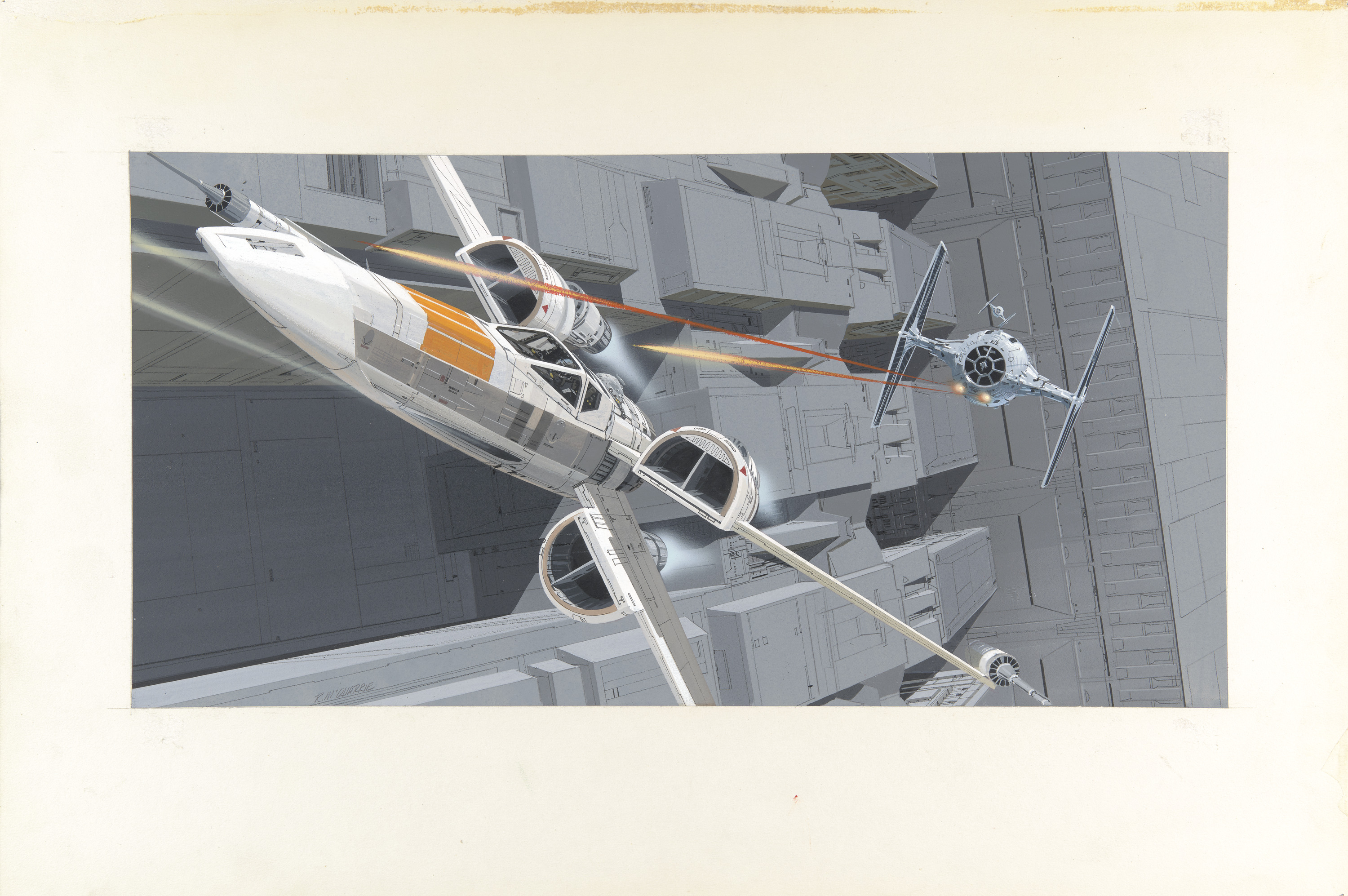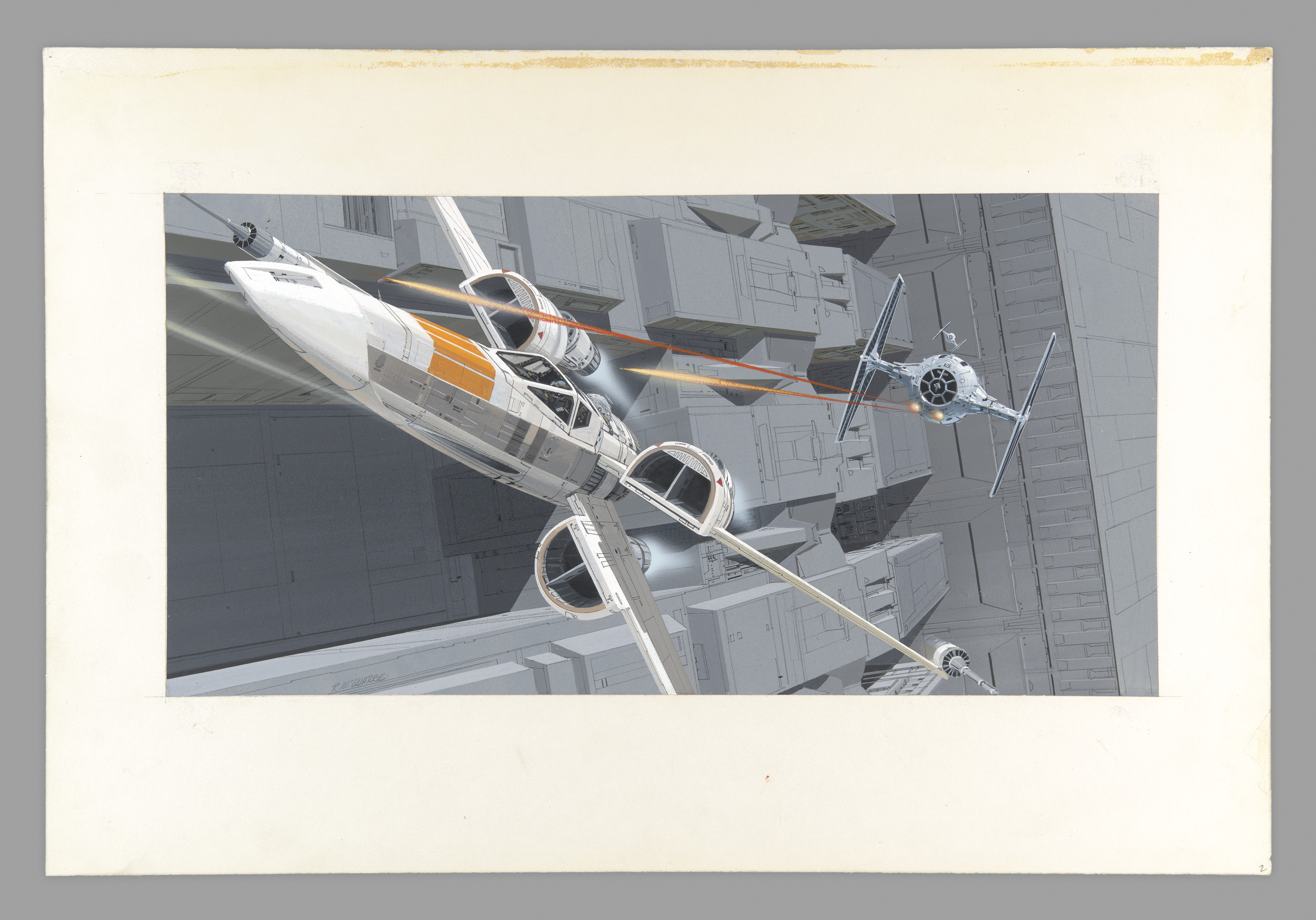 TIE Fighter attacks X-Wing in the Death Star Trench, production art for A New Hope